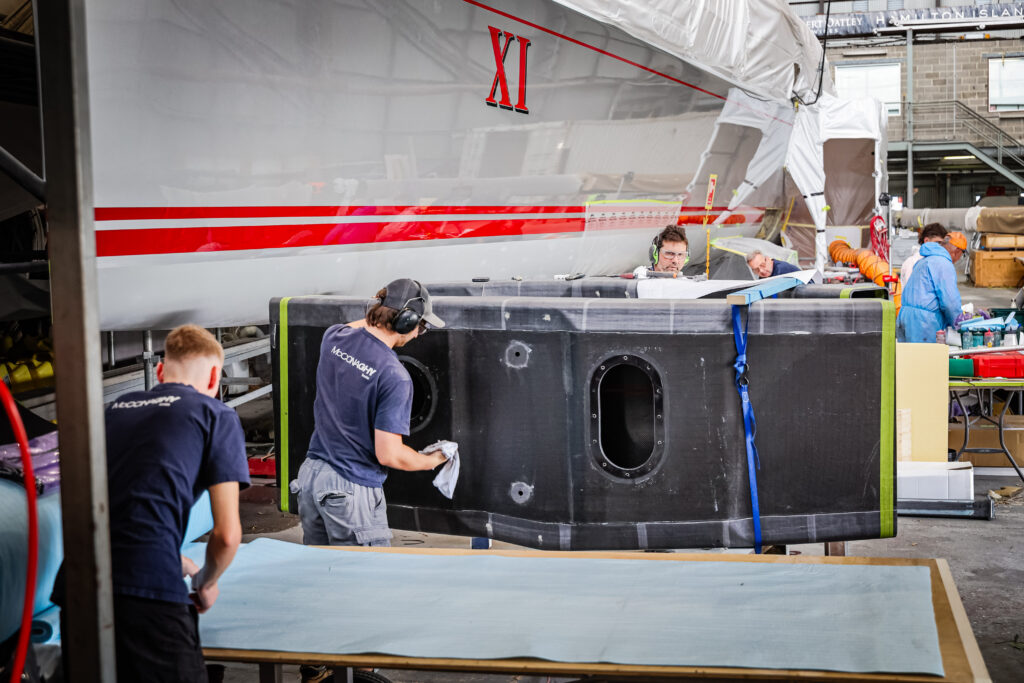 Builders prep Palm Beach XI’s C-foil daggerboard cases before installation.